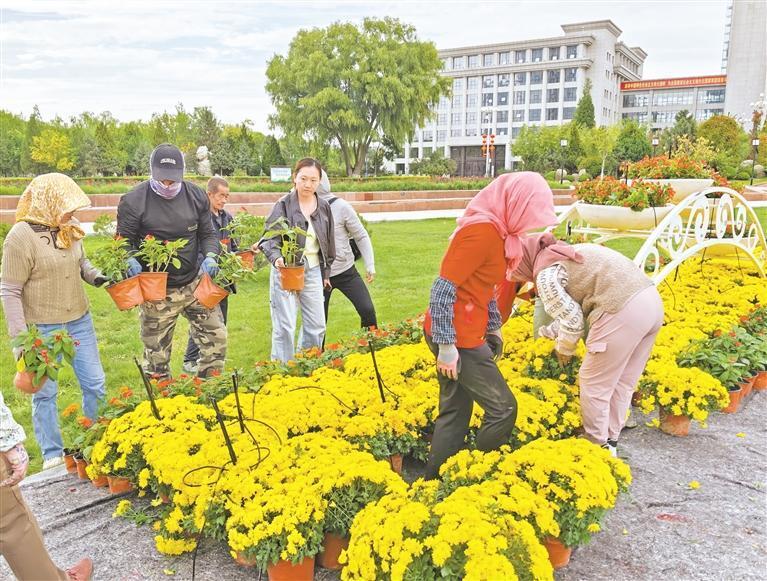 9月26日,秋日的陽光為銀川人民廣場(chǎng)鍍上一層暖金。站在高達(dá)6米的“鼓舞盛世 鳳鳴華章”立體花壇前,張穎仰頭端詳?;▔源蠡ɑ@為造型,紫紅色的三角梅、金黃的菊花、銀白的銀葉菊,巧妙地拼疊出精美的花籃紋樣,在藍(lán)天下顯得格外喜慶奪目。一陣微風(fēng)吹過,花香拂面,張穎下意識(shí)地伸手輕輕扶正一片被風(fēng)卷起的草花花瓣,動(dòng)作輕柔得像對(duì)待一件珍貴的藝術(shù)品。作為銀川市綠化養(yǎng)護(hù)中心技術(shù)骨干,張穎剛剛經(jīng)歷了一年中最忙碌的節(jié)慶景觀保障期,她的故事,就藏在這一草一木、一磚一瓦的精心營(yíng)造里。