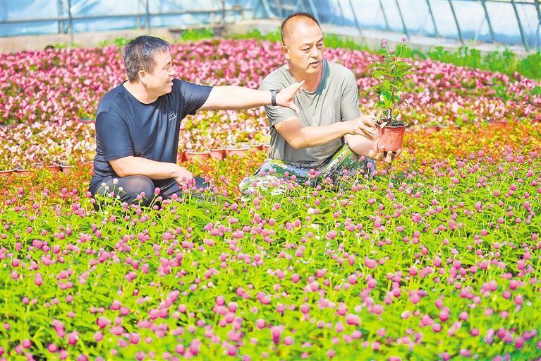 孫永平(右)和同事查看草花的長(zhǎng)勢(shì)和品質(zhì)。(圖片由受訪者提供)