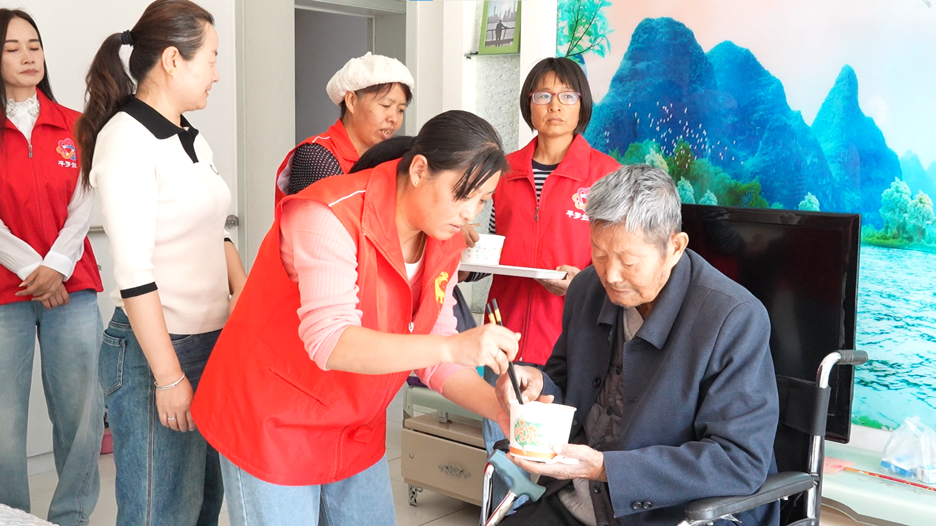 同一時(shí)間,活動(dòng)中心里也是一片溫暖景象。社區(qū)殘疾群眾圍坐在一起,邊吃面邊聊天,氣氛融洽和睦。
