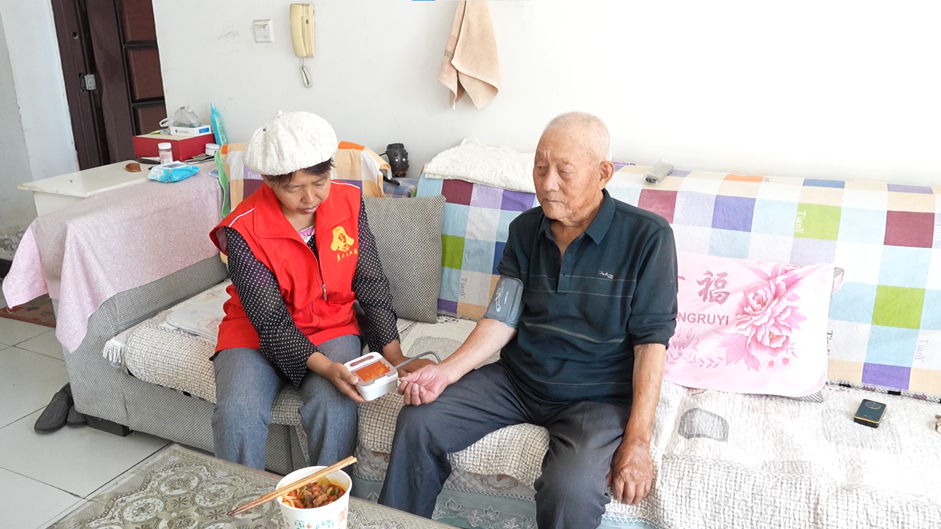 臨近中午,社區(qū)工作人員匆匆穿梭于各樓棟之間,將一碗碗打包好的臊子面送到孤寡老人家中。“叔叔,我們給您送臊子面?!惫ぷ魅藛T一邊遞上熱騰騰的面條,一邊問候老人?!昂茫x謝你們啦!”老人接過午餐,連聲道謝。送餐之后,工作人員還細(xì)心為他們測(cè)量血壓,叮囑他們注意身體,有困難隨時(shí)聯(lián)系社區(qū)。簡(jiǎn)單的話語傳遞出深切的關(guān)懷。