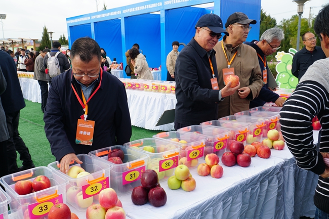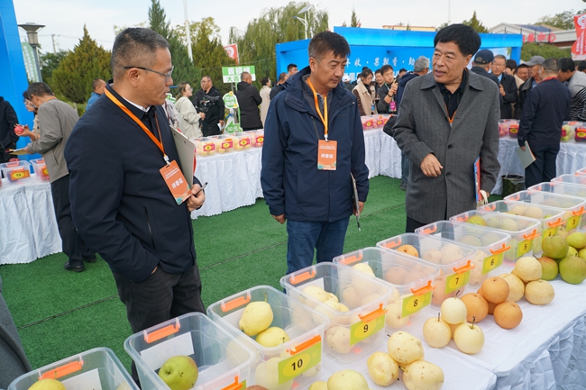 大賽現(xiàn)場,專家們正在品評參賽果品。