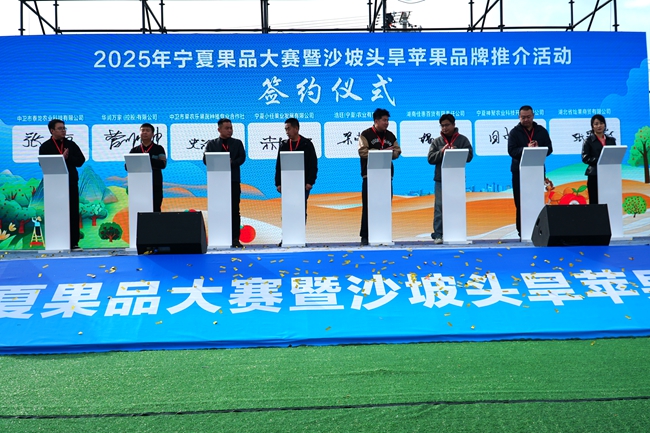 沙坡頭旱蘋果品牌推介活動在現(xiàn)場同步舉辦?;顒影l(fā)布了“沙坡頭旱蘋果”商標,并宣傳推介了沙坡頭旱蘋果、靈武長棗、彭陽紅梅杏、青銅峽大青葡萄、海原香水梨等品牌,直播帶貨活動也同步進行?,F(xiàn)場還為沙坡頭旱蘋果品牌旗艦店授牌,并為沙坡頭旱蘋果星級代辦評比、短視頻評比現(xiàn)場頒獎。區(qū)內外客商、企業(yè)進行了現(xiàn)場簽約。